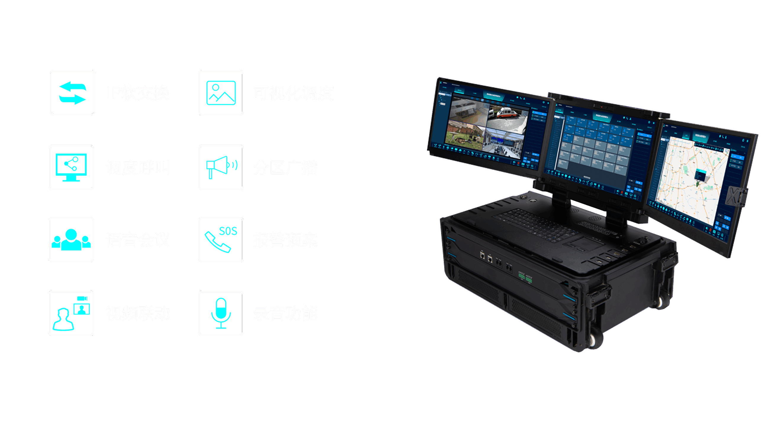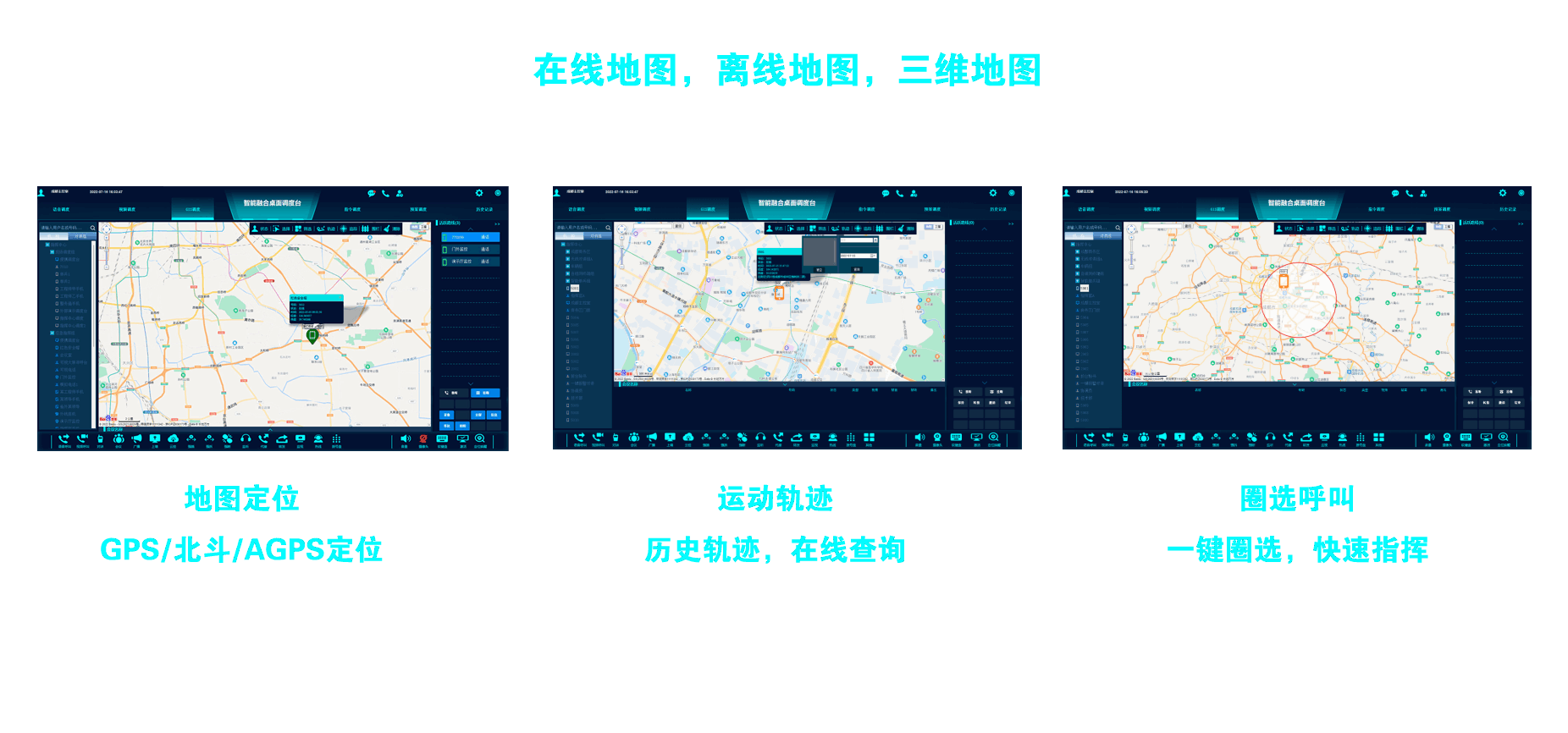 专业可视化调度操作界面,通过一张GIS电子地图可完成可视电话、可视对讲、可视广播、视频会商和远程可视化控制等操作,支持语音调度、视频调度、GIS调度、指令调度、预案调度五种调度模式。
