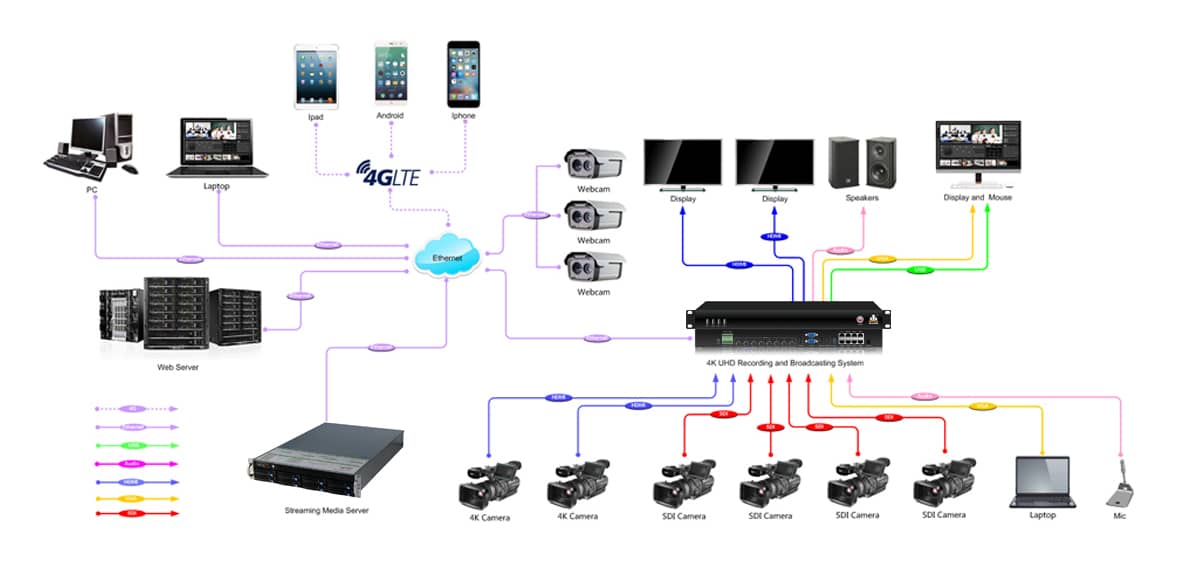 12、支持导播信号的VGA/HDMI输出,可扩展为互动式录播系统、同课异构教学研讨、校园闭路电视直播以及用户的其他应用。