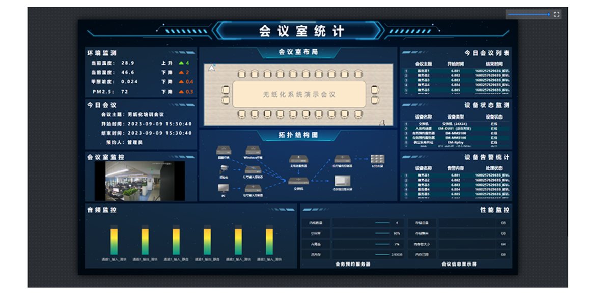 为解决以上问题,建设可以实现"空间可视化、运行可视化、数据可视化、控制智能化"的运维管理平台,为会议室内的视频会议设备运行提供保障。基于拼接大屏、PC桌面、移动端的可视化展示应用,支持整合业务系统、应用软件、数据资源、网络设备的界面和数据。运用数据可视化手段与完备的预案执行方案实现了对接入的设备监控管理,分析统计会议使用数据,通过可视化的界面展示给运维人员。