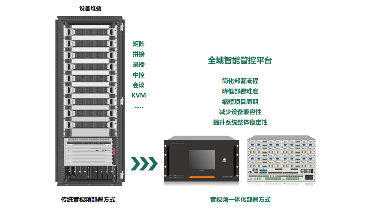 将高清视频拼接、数字音频处理、数字会议讨论、KVM坐席、中控、SIP/H.323视频会议和MCU多方互动、录播、AI智能模块、北斗定位、可视化管理等功能高度集成于一台主机,摒弃传统多设备堆砌模式,大幅简化系统搭建流程,降低部署难度,缩短项目交付周期。