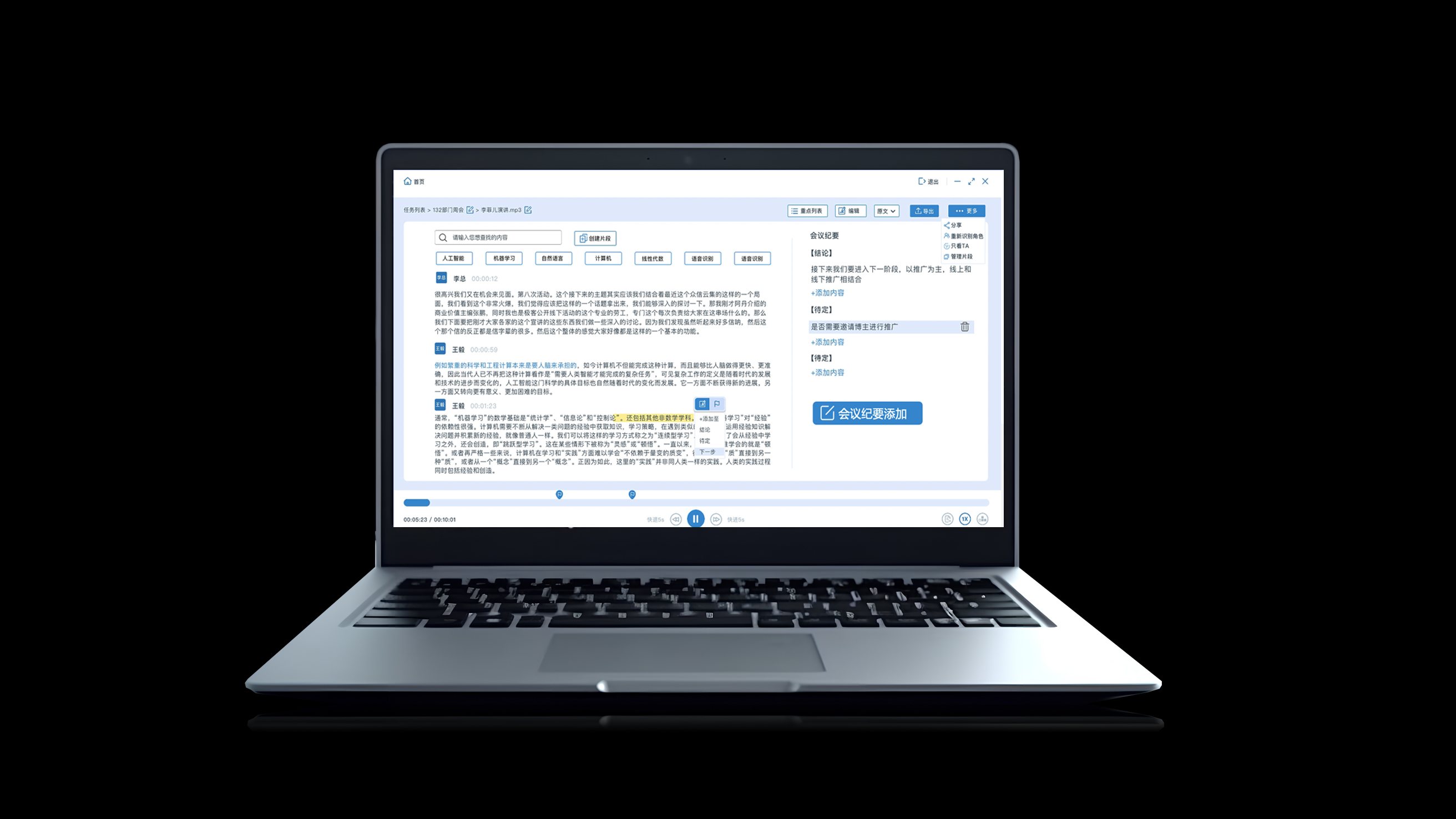 自动将会议对话转换为书面文本,支持多语言翻译,打破跨语言沟通壁垒,支持MP3、WAV、MP4、PCM、WMA等格式文件上传,1小时音频文件最快可3分钟出稿,同时可对文本进行实时编辑修改、重点标记等操作。