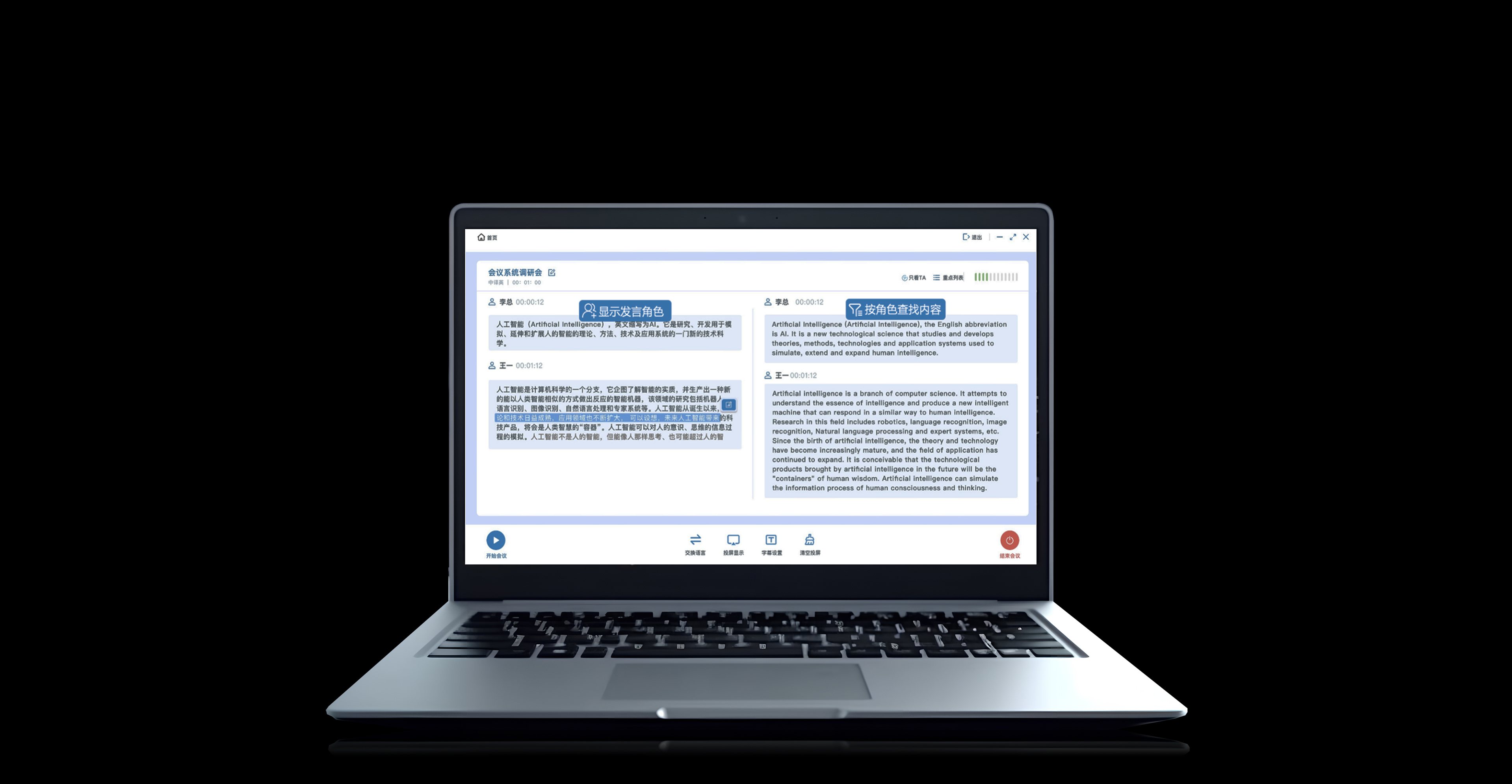 支持在会前、会中手动进行会议角色维护,同时可通过快捷键进行发言人切换。支持通过声纹识别和说话人聚类技术进行会议角色的自动区分,其中,说话人聚类仅在会议结束显示角色代称。