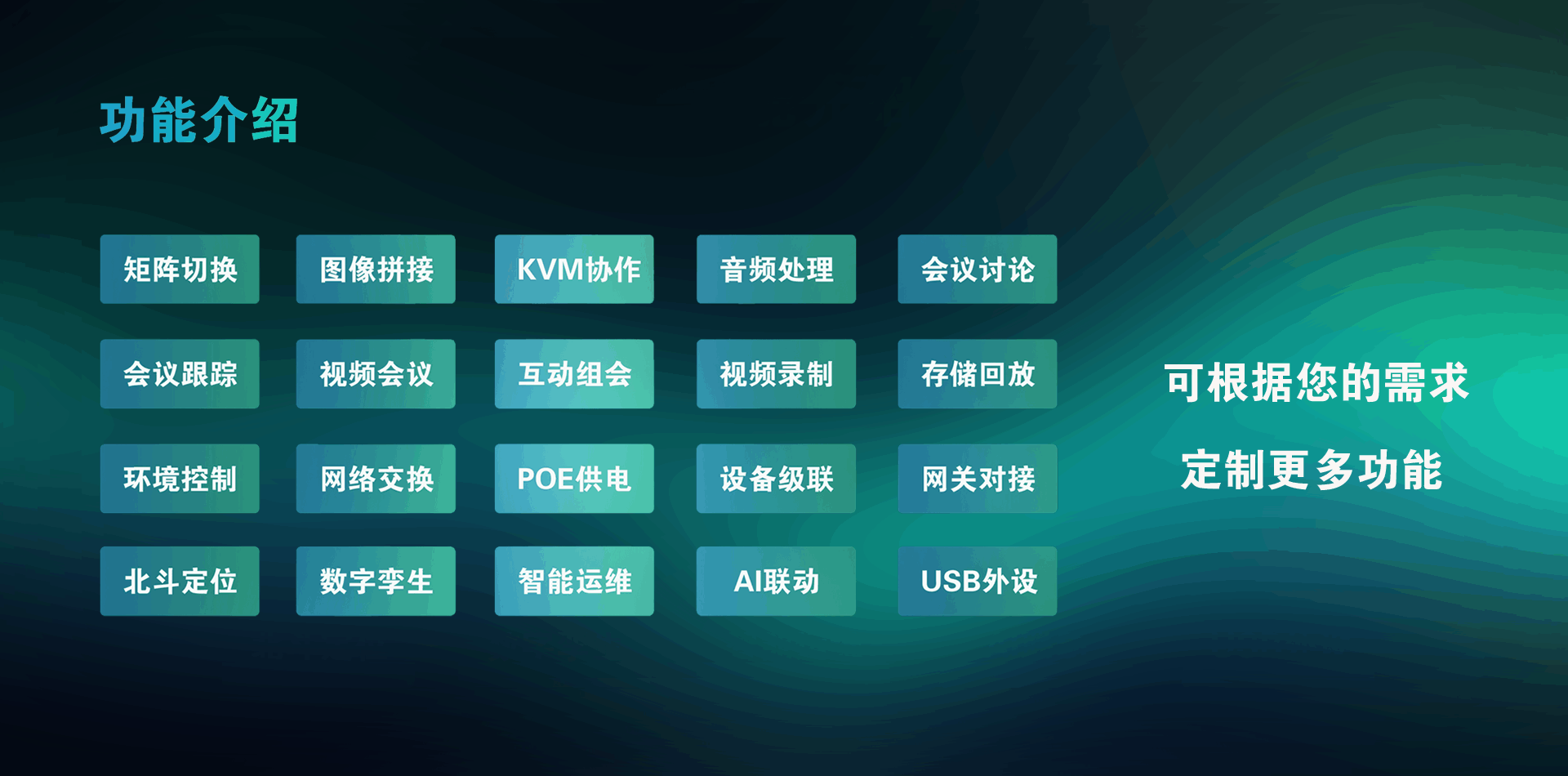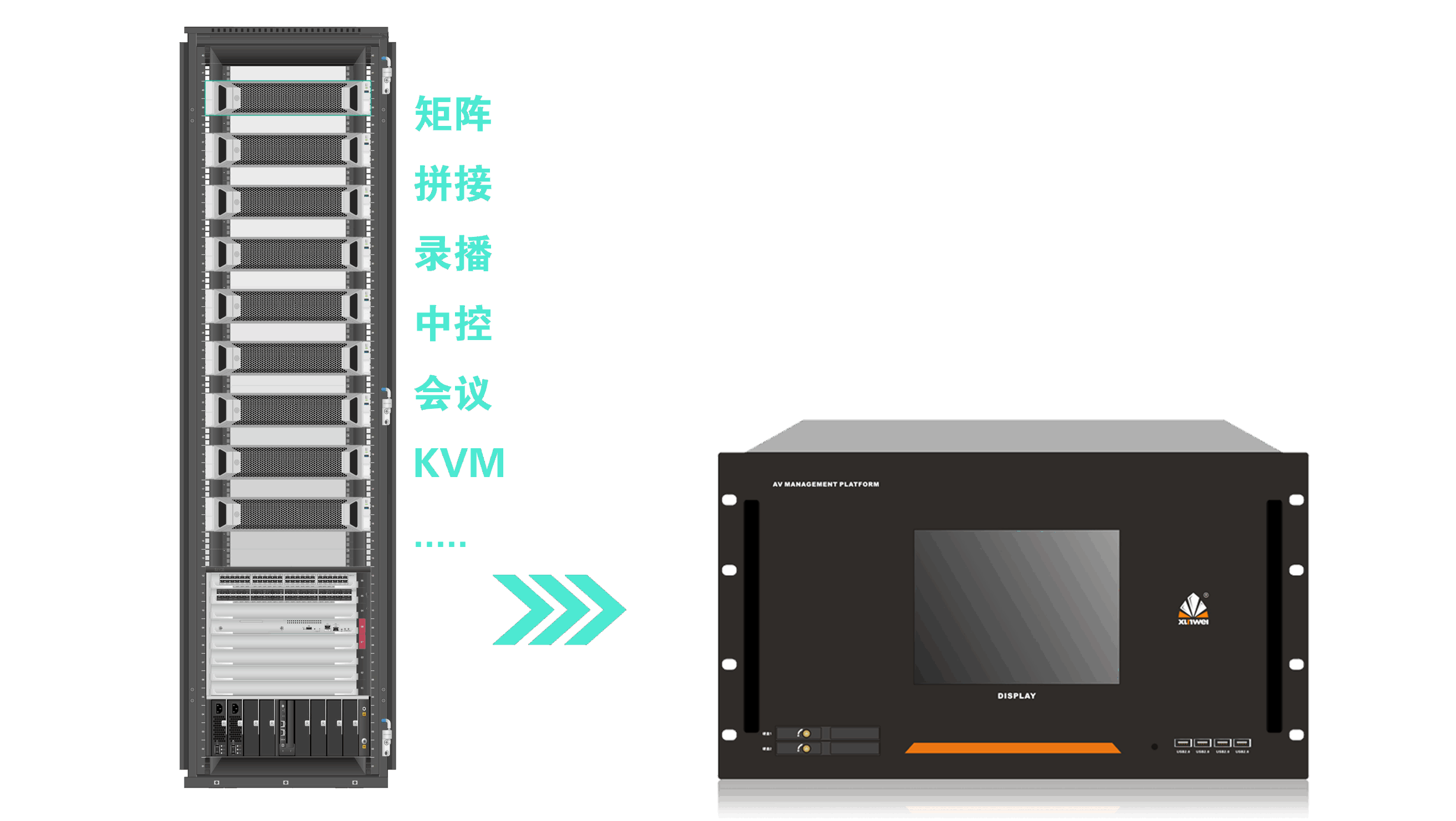 摒弃传统多设备堆砌模式,将矩阵、拼接、音频、会议、KVM坐席、中控、MCU、录播、AI模块、北斗定位、可视化管理等功能高度集成于一台主机。极致稳定
