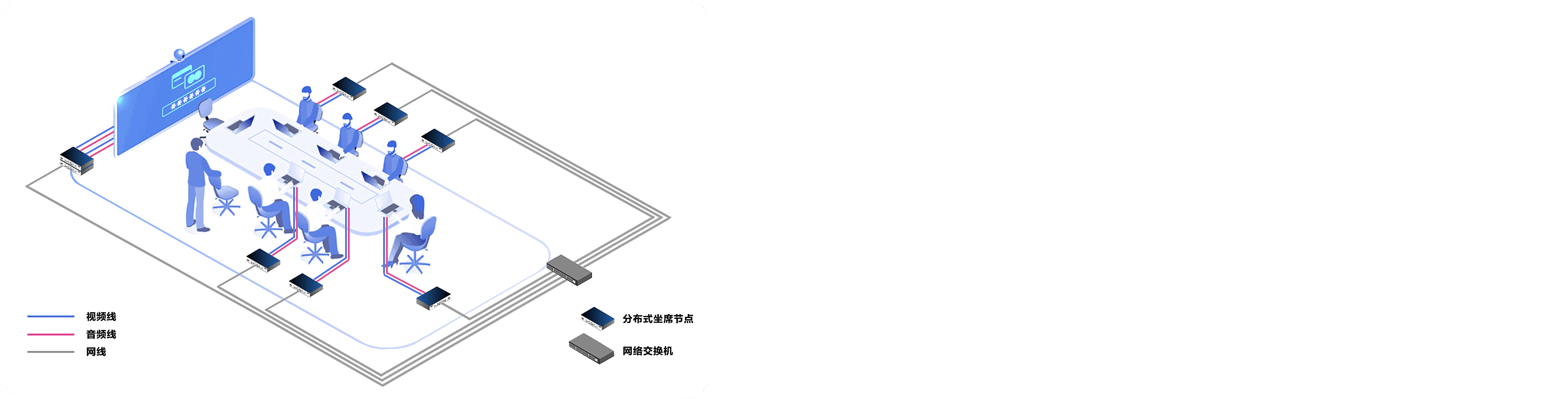 基于纯IP化网络传输架构,去中心化,无需无纸化服务器、流媒体服务器、会议终端等设备,仅需分布式坐席节点、无纸化升降显示器、会议平板即可完成系统部署,打造极简系统配置。