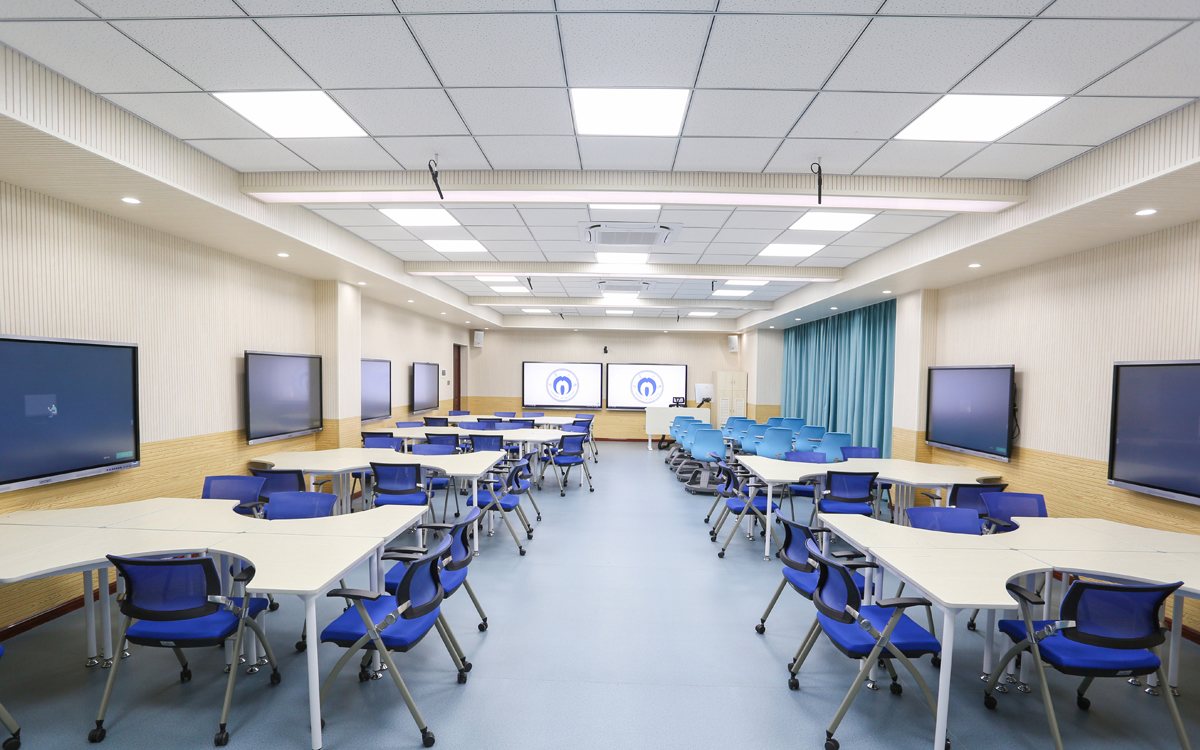 南华大学智慧教室采用圆形桌布局,便于进行小组协作/课题探究,小组侧屏为主,三端协作,便于师生,学生之间的交流与沟通,适用于小组协作教学,探究性教学。学生在教师指导下,通过以"自主、探究、合作"为特征的学习方式对当前教学内容中的主要知识点进行自主学习、深入探究并进行小组合作交流。