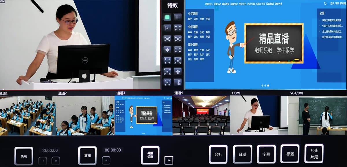 12、支持导播信号的VGA/HDMI输出,可扩展为互动式录播系统、同课异构教学研讨、校园闭路电视直播以及用户的其他应用。