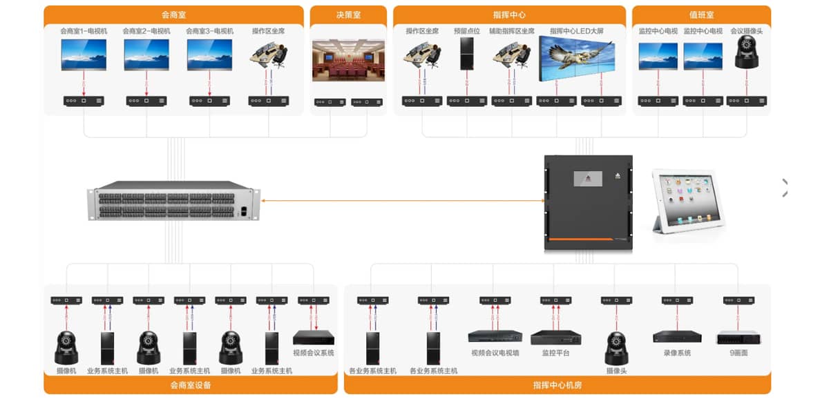 单位指挥中心系统建设内容包括:综合布线系统、计算机网络系统、卫星接收、有线电视系统、有线广播系统、电话通讯系统、楼宇设备自动化管理系统、安保监控系统、智能卡系统、会议室的会议系统、灯光、音响和投影系统、大屏幕公告栏与触摸屏引导系统、UPS电源管理系统、系统集成、GPS警用通信系统、防雷与接地、机房建设、管路桥架、机柜。