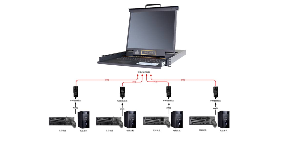 网络KVM切换器具备RJ45 console接口,把键盘鼠标和显示器信号进行整合处理传送给控制主机,这样可以提升系统的高度集成化和稳定性。但是对于远程控制,部分KVM设备需要增另加TCP/IP远程管理控制器和控制主机相连才能实现KVM over IP,通过局域网或internet远程登录到KVM控制器, 在web图形管理界面管理每一台服务器,跟本地访问无异。