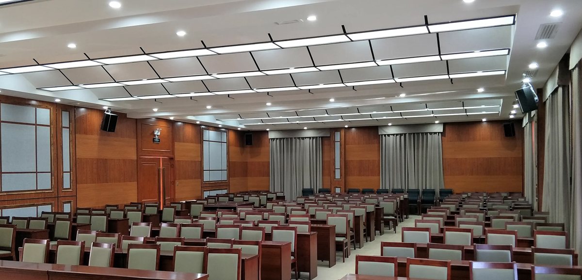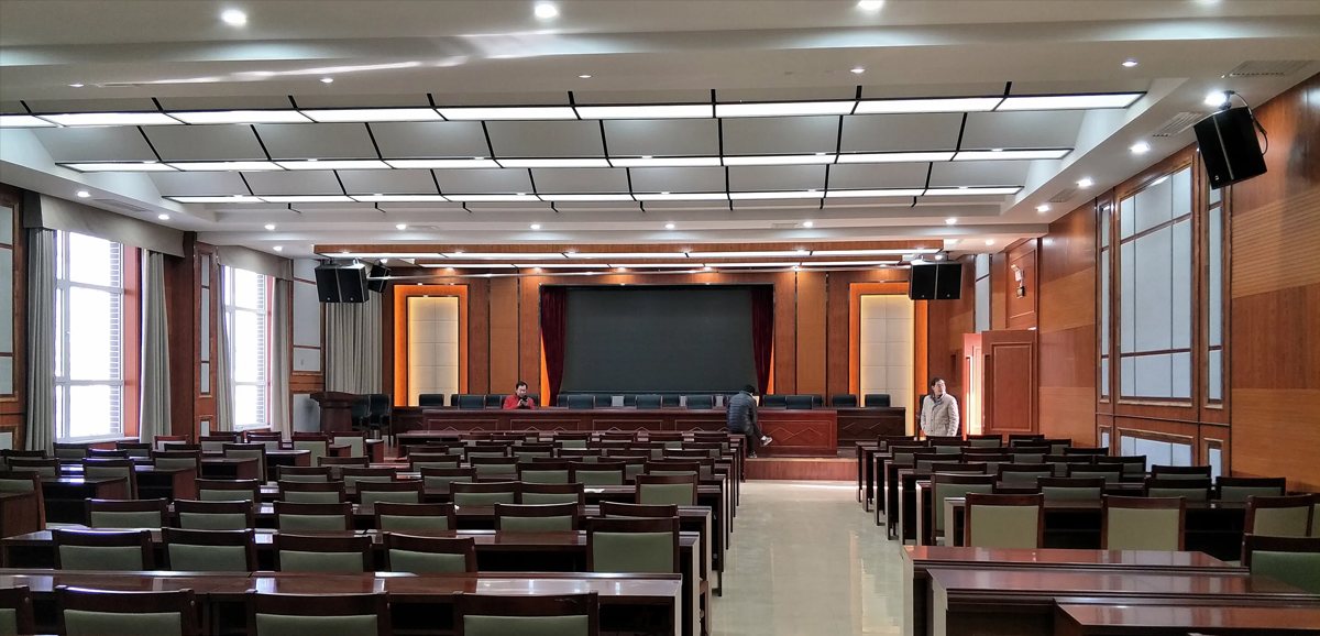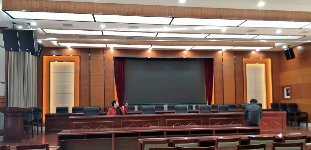 b、设计4只额定功率300W/8Ω辅助音箱(由2台2*450W功放驱动)音箱安装在会场两侧墙上。