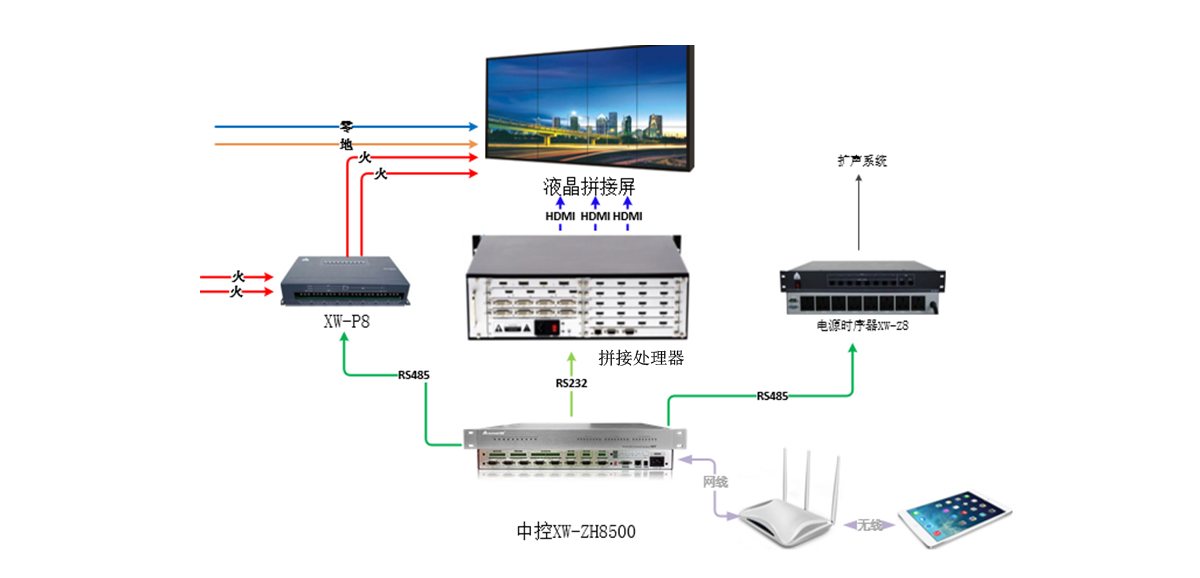 从1楼配电箱内取电,引一组YJV 3*16平方进入机房 ,在机房新建1个配电箱用于大屏电源控制,将8路电源控制器配置在此电箱内,将大屏分为4部分,用电源控制其中的4路控制大屏的开关。从中控主机处拉1根控制线缆过来,从而实现平板控制大屏开关。