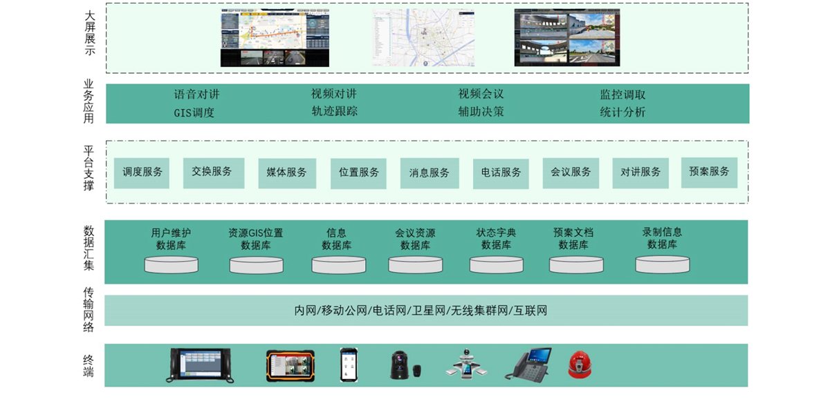 •业务层:语音对讲、视频回传、图片拍传、取证记录、任务派遣、视频分发、多屏监控、GIS应用、静默监控、应急预案、应急调度、部门协调、视频会议、巡检管理,等等,主要完成本系统业务功能的逻辑应用,以及融合通信接入,包括常规对讲系统接入、广播通信系统接入、电话办公系统接入、短信通信系统接入、视频监控系统接入、物联网预警接入、智慧AI系统接入,等等。