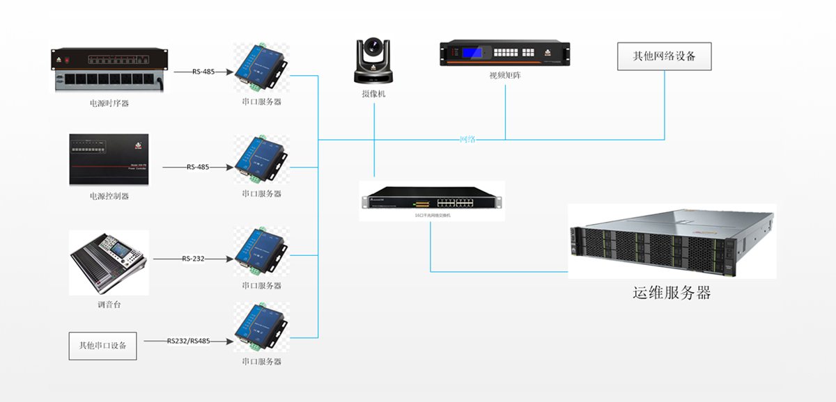 通过串口服务器将灯光控制器、电源控制器、调音台只具有串口协议,未具备网络协议转换成网络和平台通信;无纸化系统、矩阵、摄像机等拥有网络通信的能力的设备通过网络直接对接平台服务器实现数据传输和数据下发,平台通过协议对接这些设备实现灯光开关、设备开关、音量大小、视频切换、摄像机云台控制、升降器升降等功能。