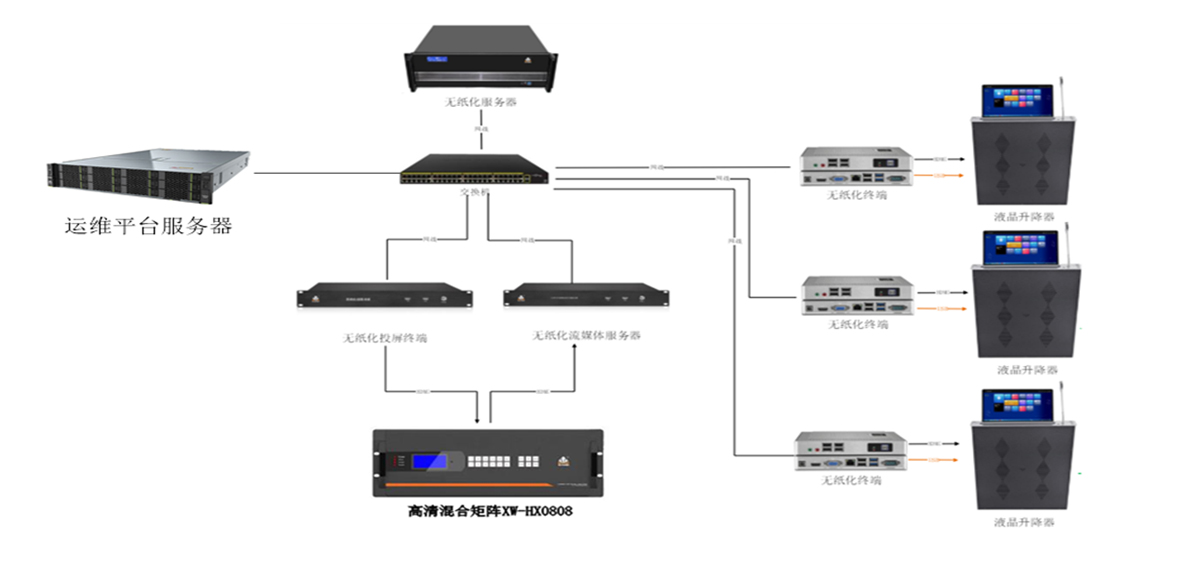 某单位有多个会议室,有无纸化会议室一间,常规会议二间,会议室有无纸化系统,视频处理系统,音频扩声系统,LED大屏系统,其中包含设备有交换机、LED大屏、视频处理器、矩阵切换器、调音台、音响、功放、时序器、电源控制器、会议摄像机、会议门口屏、升降器、无纸化服务器、无纸化终端、无纸化编码器、无纸化解码器等设备。