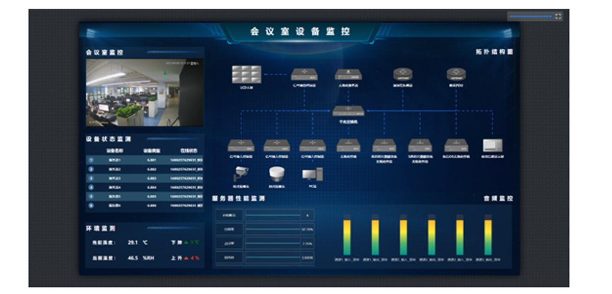在机房部署一套可视化运维管理服务器,用于平台部署,数据信息存储。通过值班室电脑或手机可连接平台服务器管理会议室设备,查看会议室各项数据,通过大屏可视化观看设备运行情况及会议室使用情况及数据展示。