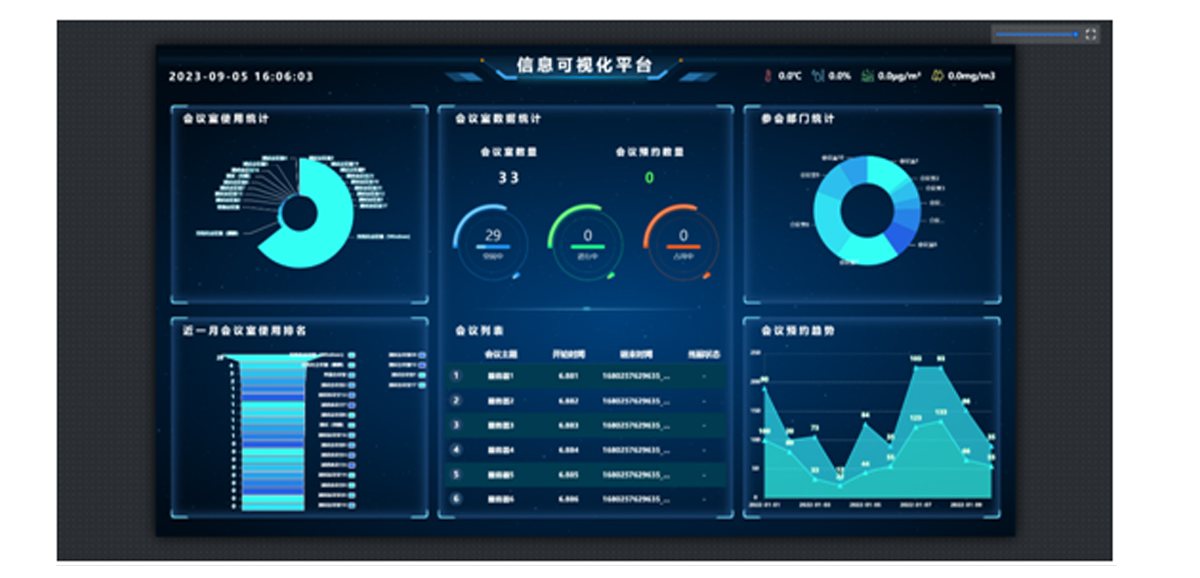 制作一套可视化看板,通过树状图显示设备使用次数、折线图等显示能耗信息,三维模拟会议室场景图,很直观的了解会议室状态。异常情况红色或者特殊颜色显示报警信息。