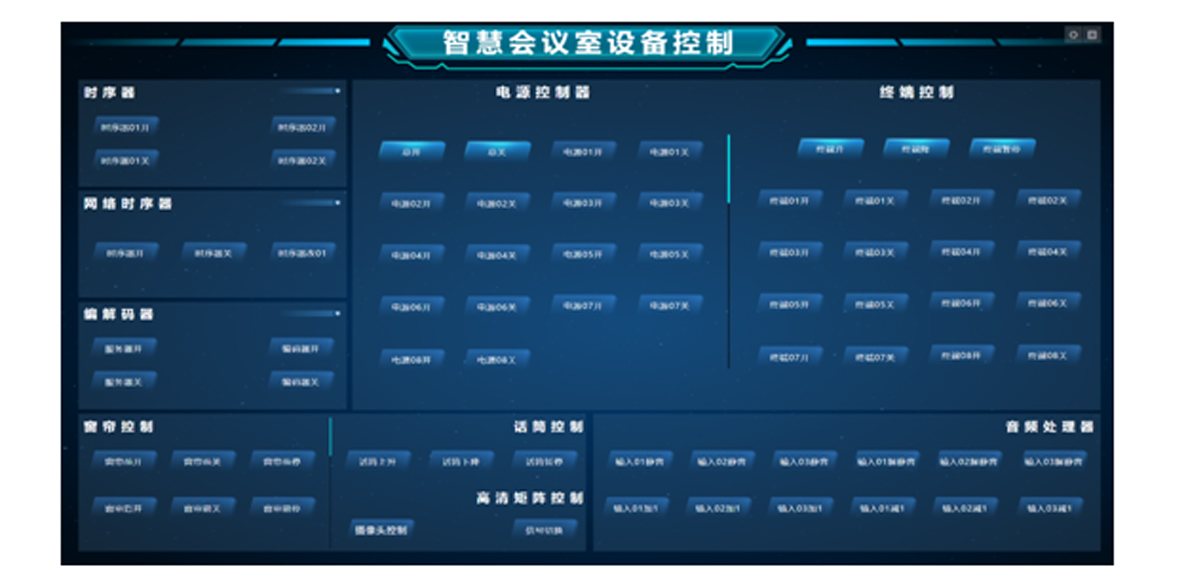 设备接入后可实现场景预案源的调用,如在会议开始之前,可自动执行空间内的灯光开启/关闭或灯光自动调节亮度,窗帘的打开或关闭、温度湿度的调节,各个终端设备开机等。