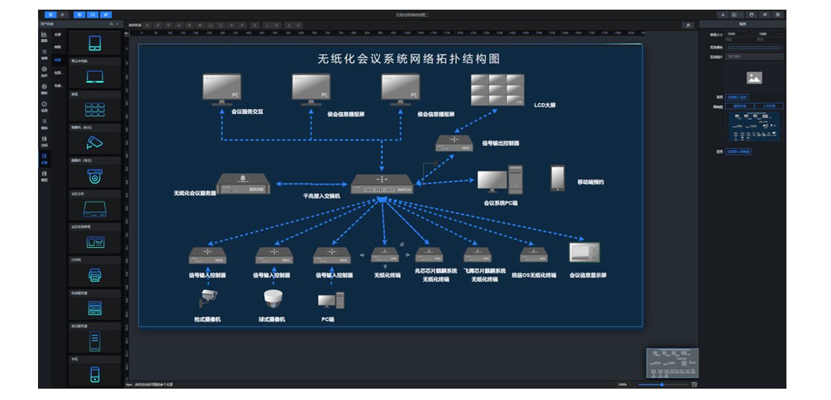 系统内置网络、终端等设备类型,用户可根据会议室的拓扑结构图,以图形的形式展示,可实现设备间的连线,便于明确设备间是怎样的布线方式,发生故障时,可准确知道拓扑结构中哪个环节出现问题;