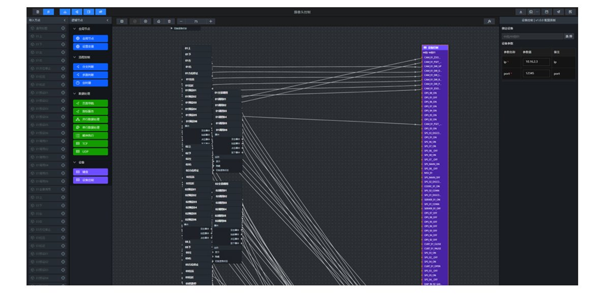 并行数据处理节点是使用并行方式处理多个事件,各事件之间互不影响,添加并行数据处理节点至画布中,可查看支持的时间和动作以及配置参数。串行数据处理节点是使用串行方式来处理一个事件,添加串行数据处理节点至画布中,可查看支持的事件和动作以及配置参数。顺序执行是当对下游节点的动作执行有顺序要求时,可使用顺序执行节点,保证动作从上到下依次执行,添加顺序执行节点至画布中,可查看支持的事件和动作以及配置参数。页面导航是打开其他页面的开关,可添加链接地址,当打开页面事件触发时,可自动跳转至设置好的页面中。TCP/UDP 节点可根据IP和端口以及编码格式等直接与设备进行数据交换,便于管理人员操作以及获取设备数据,节点之间均通过锚点连线的形式进行连接,操作简洁。