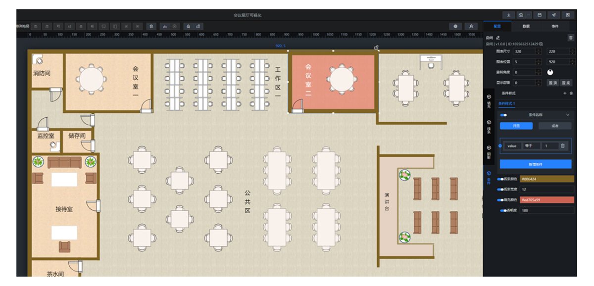 当利用空间组件展示平面布局图时,可以通过设置条件来展示当前空间的占用状态,通过占空传感器监测到的数据,反馈给系统一个状态值,当达到这个状态值的时候会显示红色,说明当前空间正在被占用,当处于空闲状态时,会自动显示为原来的颜色,以表示空间资源已释放,处于空闲状态。