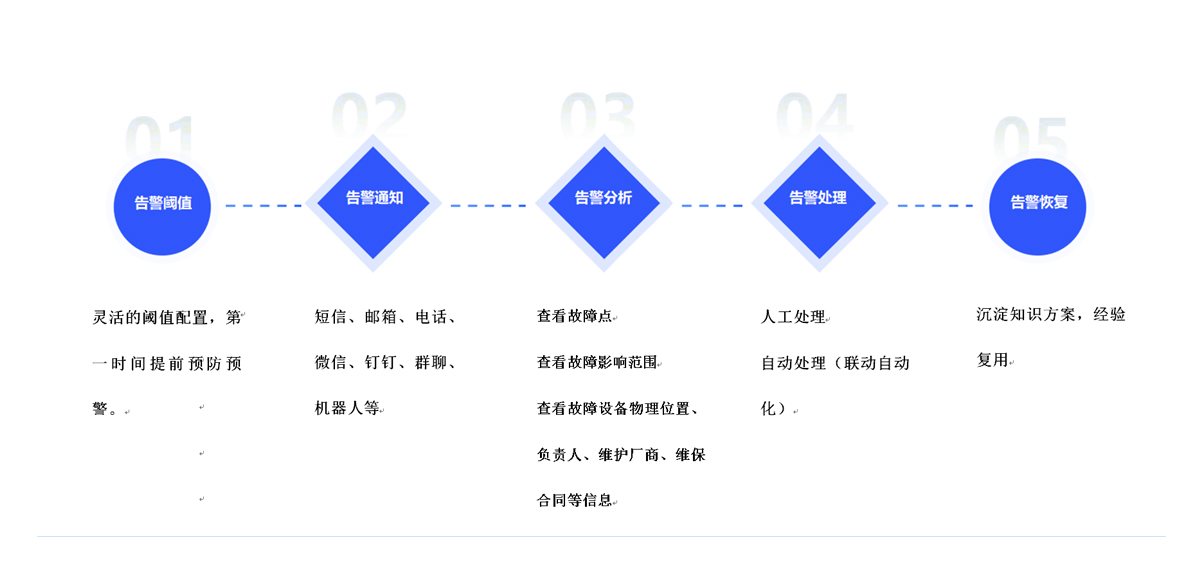 事前:灵活的告警通知,第一时间掌握故障信息;短信、邮箱、电话、微信、钉钉、群聊、机器人等通知方式;告警响应机制+故障升级机制,告警无遗漏;移动运维,第一时间掌握故障信息。
