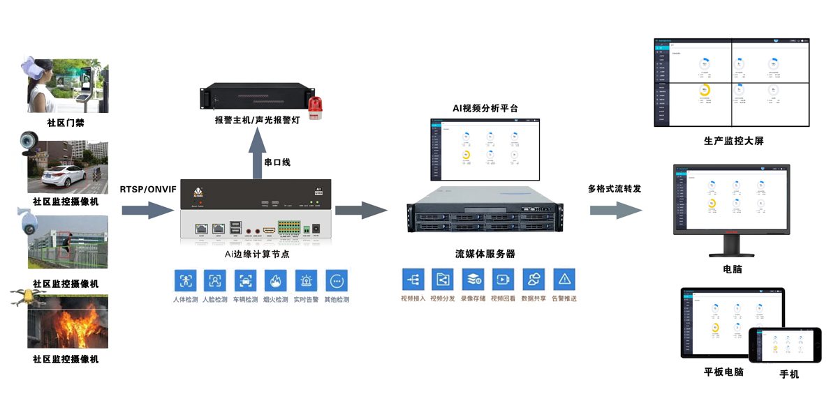 2、AI边缘计算盒子应用:在社区服务中心部署,统一接入AI边缘计算盒子这一前端安防设备,实现数据汇聚、告警上报、算法分析展示,并与机器视觉平台对接,保障数据安全高效传输。