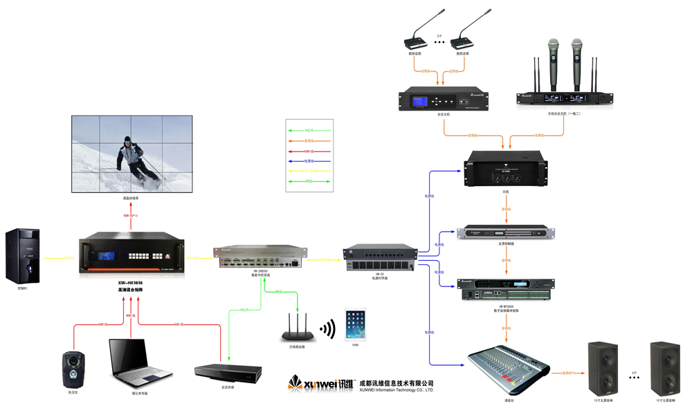 核心设备:选用讯维高清混合矩阵主机,支持多种信号输入(如HDMI、DVI、VGA、SDI等)和输出(如HDMI、DisplayPort等),确保与各种信号源和显示设备的兼容。
