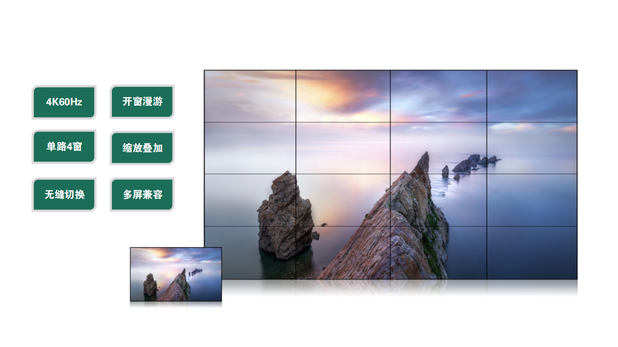 将高清视频拼接、数字音频处理、数字会议讨论、KVM坐席、中控、SIP/H.323视频会议和MCU多方互动、录播、AI智能模块、北斗定位、可视化管理等功能高度集成于一台主机,摒弃传统多设备堆砌模式,大幅简化系统搭建流程,降低部署难度,缩短项目交付周期。